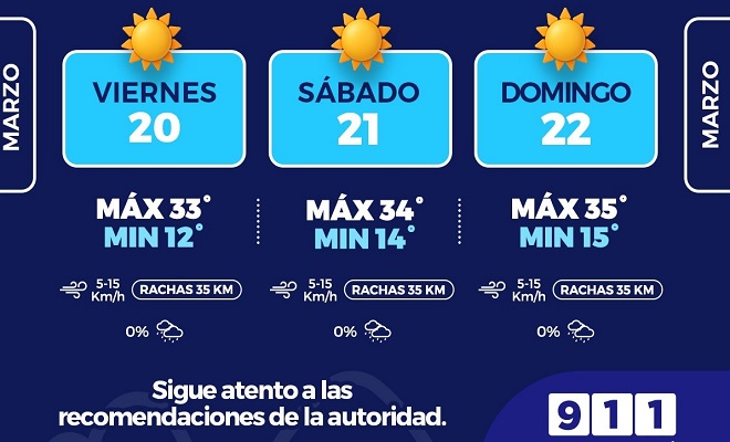 Ciudad de Chihuahua.- La Coordinación Municipal de Protección Civil, informa que para este fin de semana se prevén condiciones mayormente soleadas y un incremento gradual en las temperaturas, por lo que exhortan a cuidarse del calor para evitar afecciones a la salud.