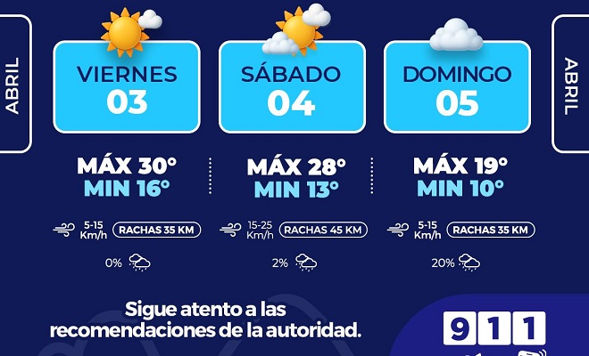 Ciudad de Chihuahua.- La Coordinación Municipal de Protección Civil, informa que, para este fin de semana, del 3 al 5 de abril, se tendrán días calurosos y probabilidad de lluvia ligera para el domingo, por lo que exhortan a tomar precauciones y planificar actividades.