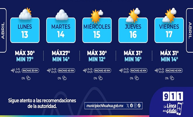 Ciudad de Chihuahua.- La Coordinación Municipal de Protección Civil, informa que esta semana se esperan días calurosos donde predominan días nublados, sin probabilidad de lluvias.