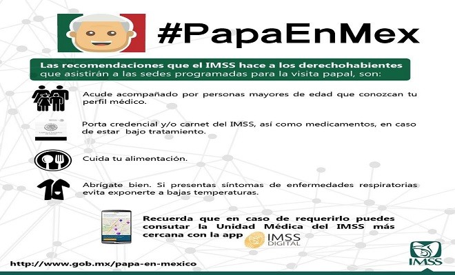 El Instituto Mexicano del Seguro Social (IMSS), hace algunas recomendaciones a la población que va a asistir al evento masivo que presidirá el Papa Francisco, en Ciudad Juárez, con el propósito de que eviten posibles complicaciones en cuanto a salud se refiere.