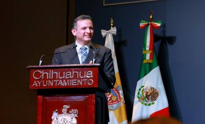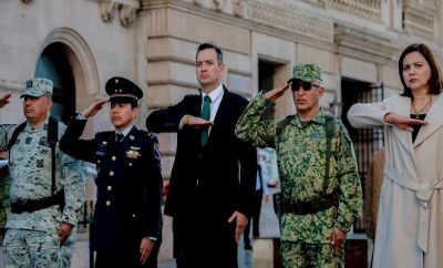 Ciudad de Chihuahua.- El alcalde Marco Bonilla junto a autoridades federales y estatales, izaron la bandera de México...