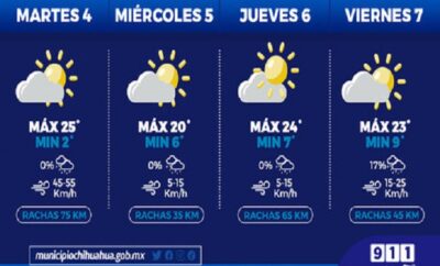 – Para este martes se esperan ráfagas de viento de hasta 75 kilómetros por hora. Ciudad de Chihuahua.-...